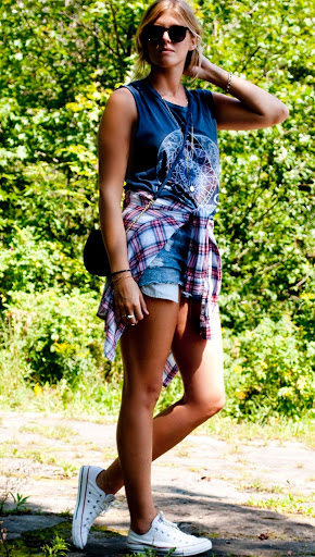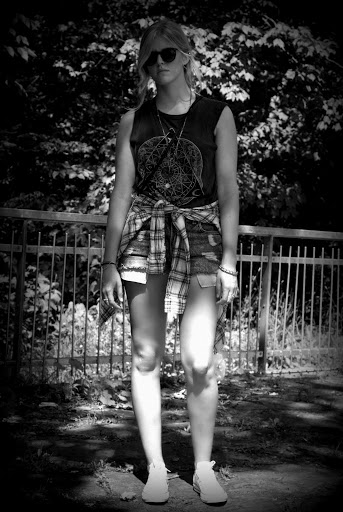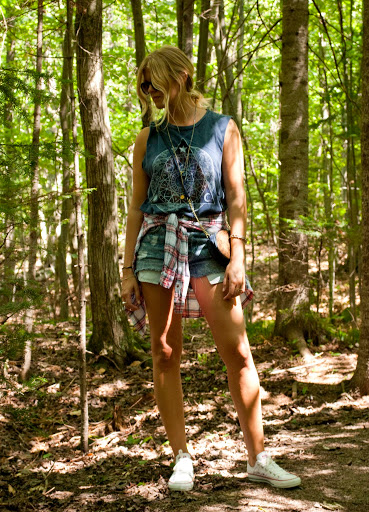 Shirt H&M (old), Shoes Converse Browns, Shorts Urban Outfitters (can’t put UO link because not accessible in Quebec), purse H&M, Sunglasses Pangea (in-store, Nashville), Rings + ear cuff UO, Shirt UO.