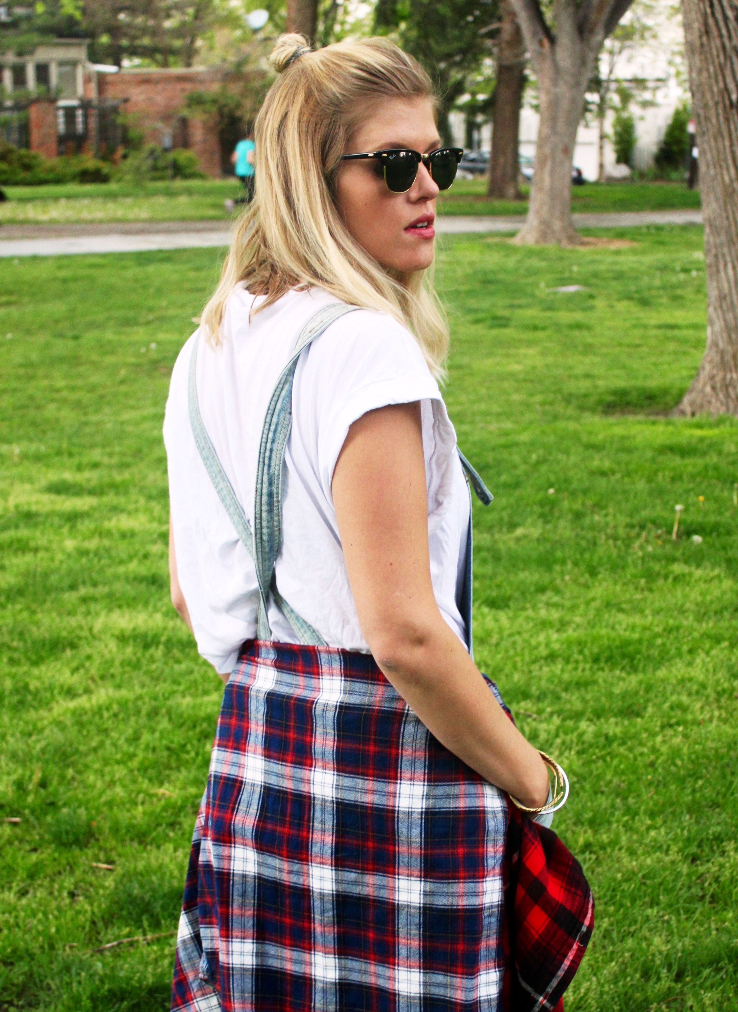 Overalls: Free People, Sunglasses: Ray-Ban, Shoes: Birkenstock. The plaid shirt is old from Joe Fresh and the T-shirt is from Mango, also sold out.