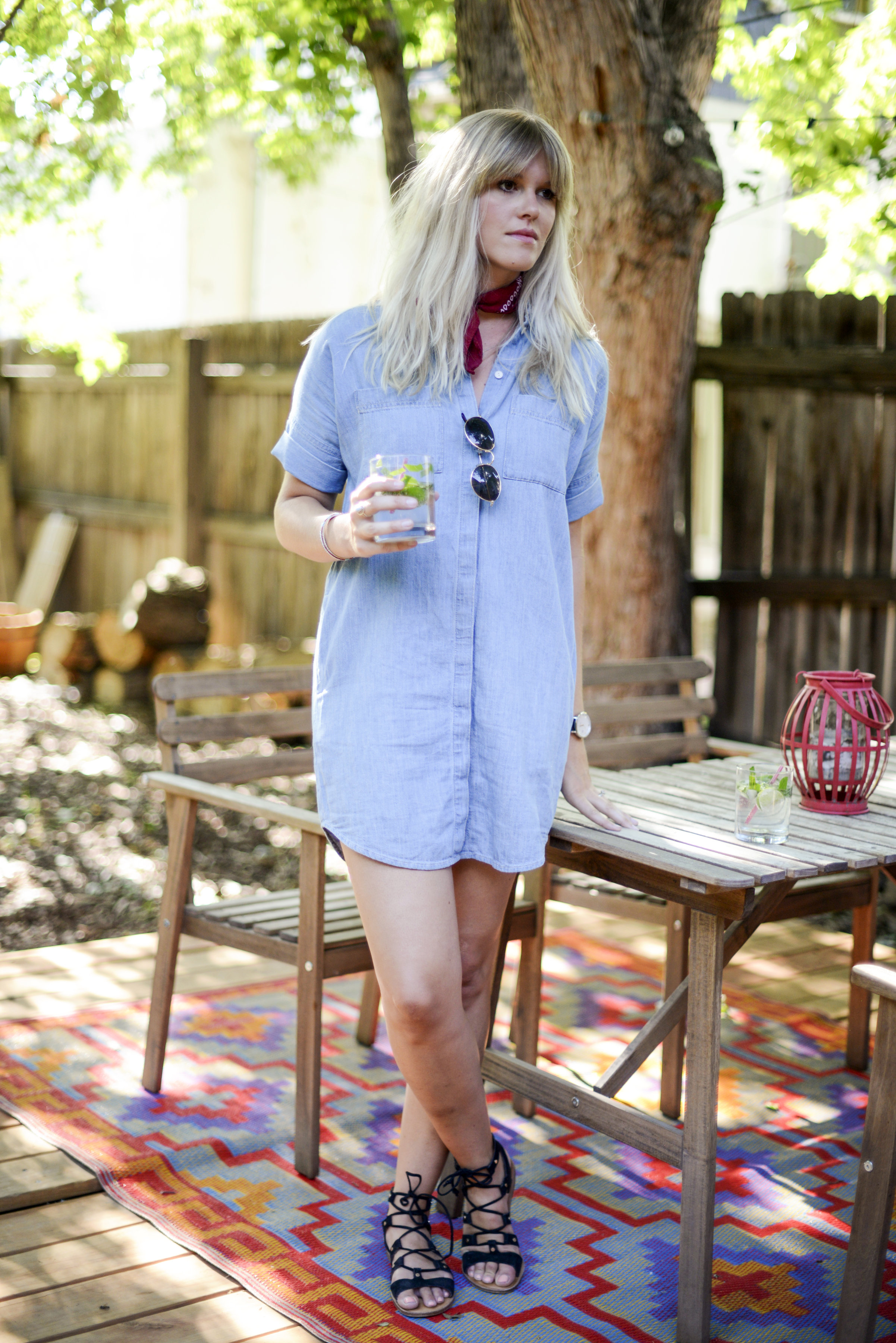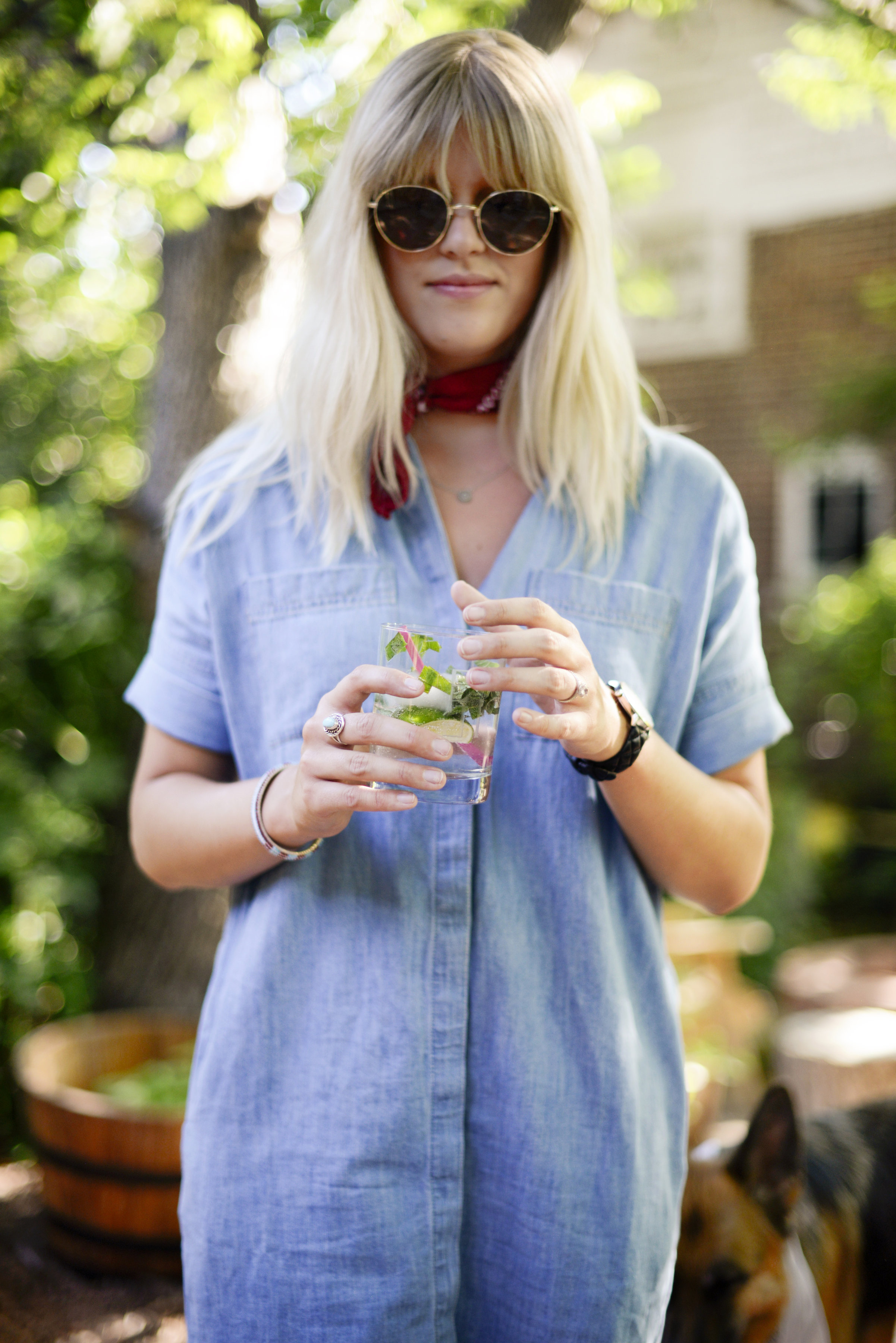 I have so much mint in my garden, it’s getting ridiculous. I think it’s an invasion! At least I love mojitos, so I’ve made those my drink of predilection this summer… and my official 4th of July drink as well. And as my official outfit, well… I’ve adopted a really easy one. A denim dress, a red bandana, and that’s it. I’m not really into wearing the American flag (or wearing the Canada flag or Quebec flag, since this is where I’m from). I’ve tried it in the past, and it always makes me feel like I’m wearing a costume. So I just try to incorporate the colors into a regular outfit to make it fun, and add a bandana for the missing color (they’re pretty on trend right now).